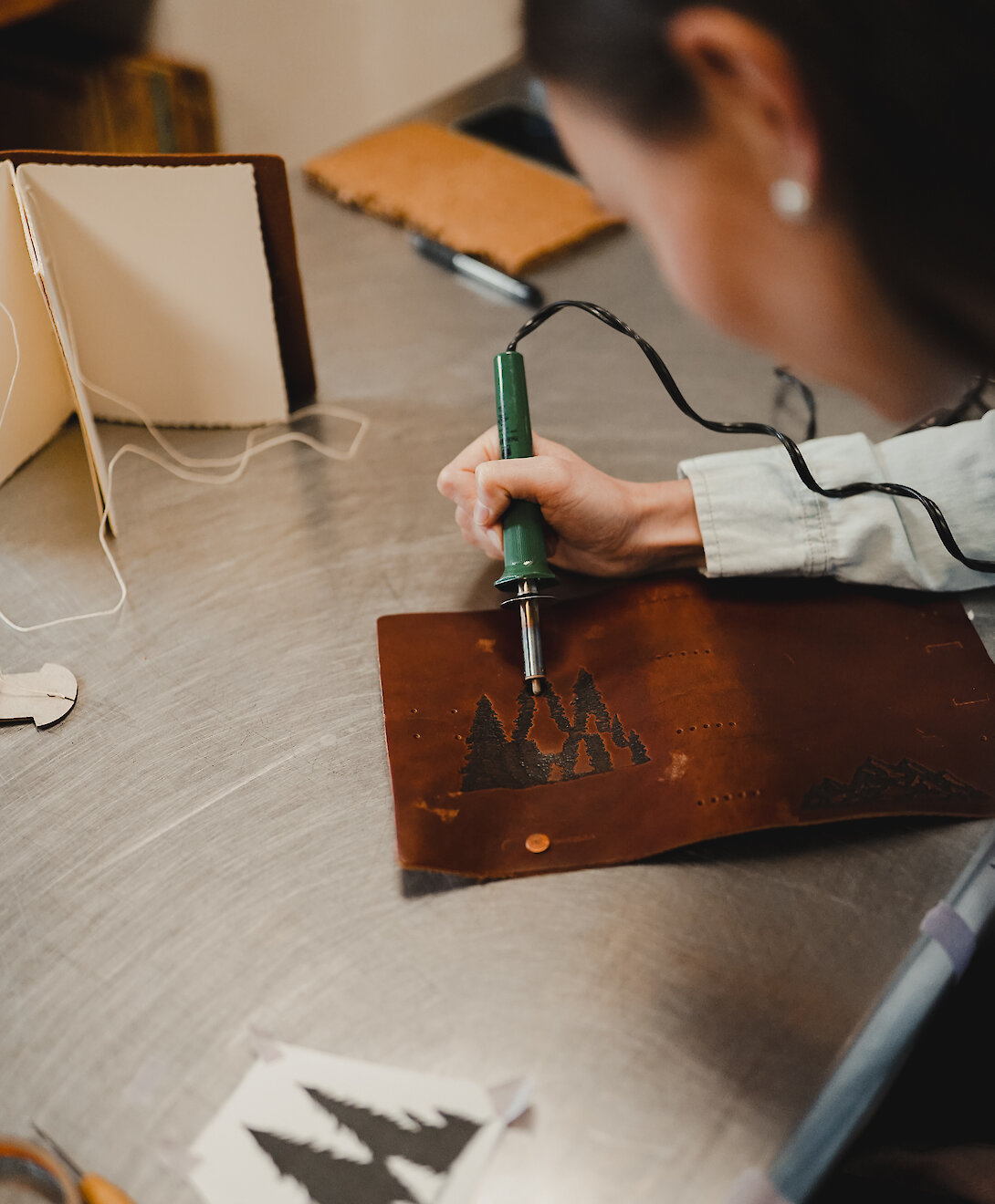 See your memories take shape beneath your hands as you create your own custom leather journal. Design and imprint the leather cover with metal stamps and burning tools, then create paper signatures and stitch them to the cover for a one-of-a-kind journal or notebook.