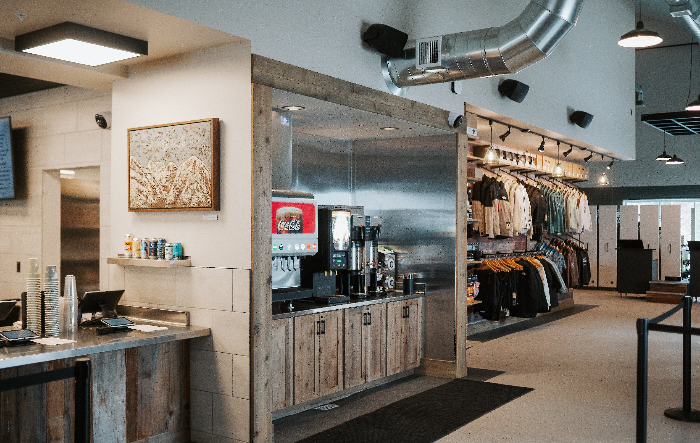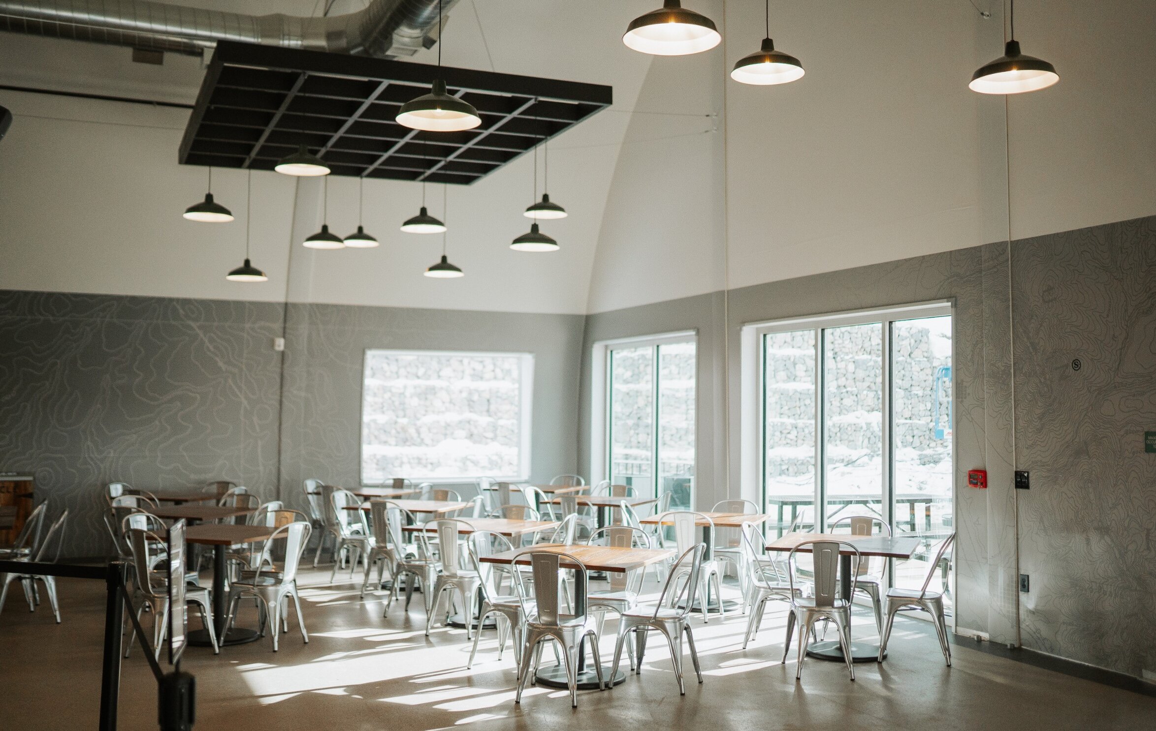 The Mountain Camp Day Lodge is not just a hub for convenience; it’s a testament to thoughtful design and sustainability. Upcycled materials play a central role in the lodge’s construction and decor, making it as eco-friendly as it is beautiful. Reclaimed wood from around the resort has been transformed into stunning tabletops, adding warmth and character to the space. The lighting fixtures are a work of art, crafted from glass blown on-site to reflect the resort’s commitment to local craftsmanship and sustainable practices.
