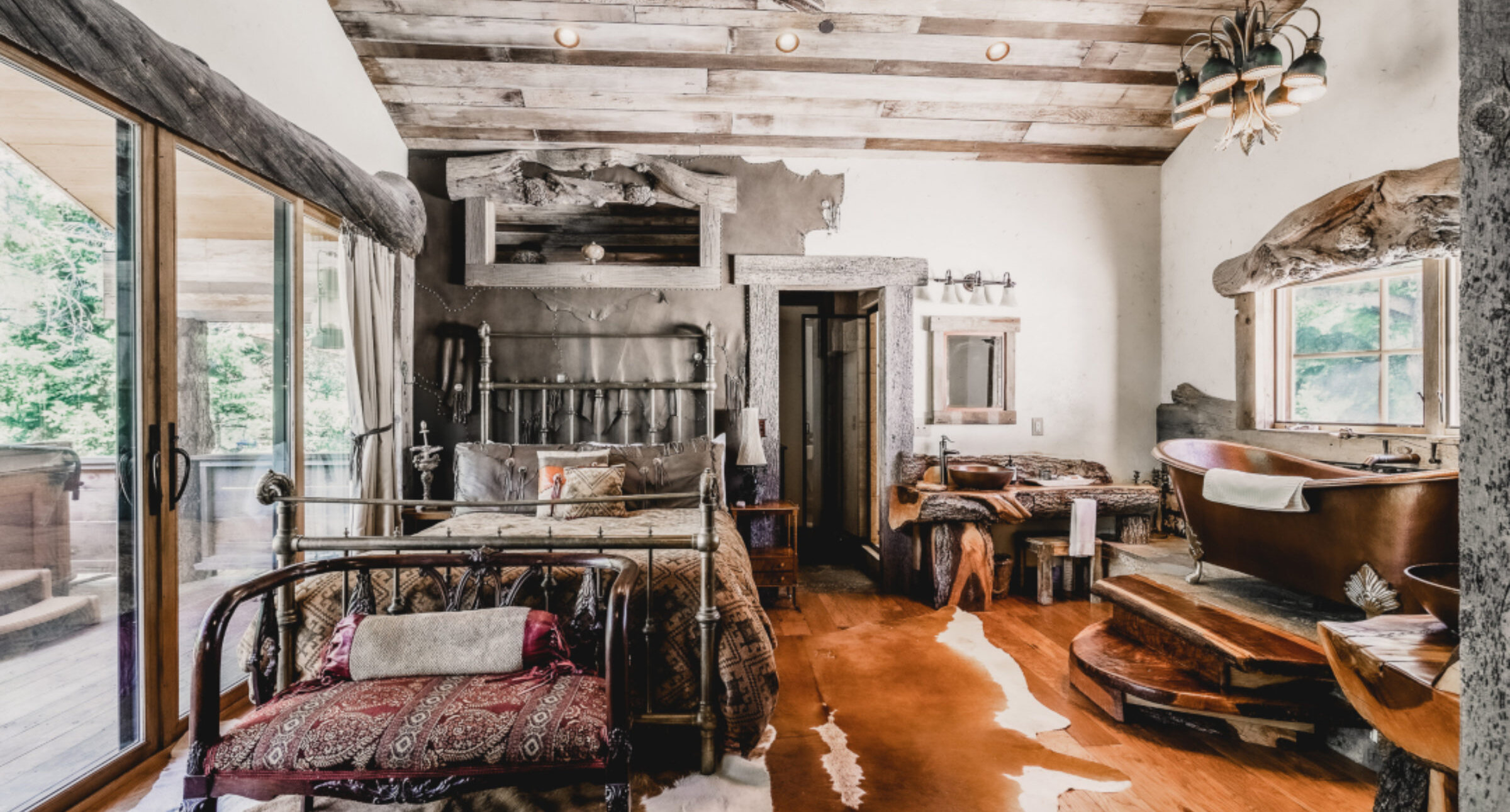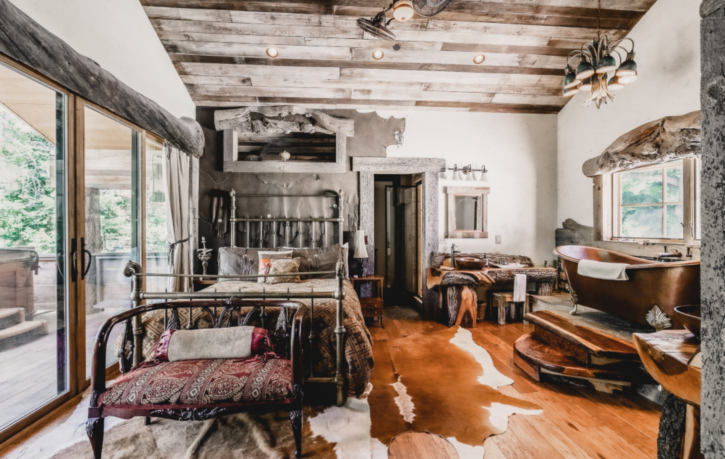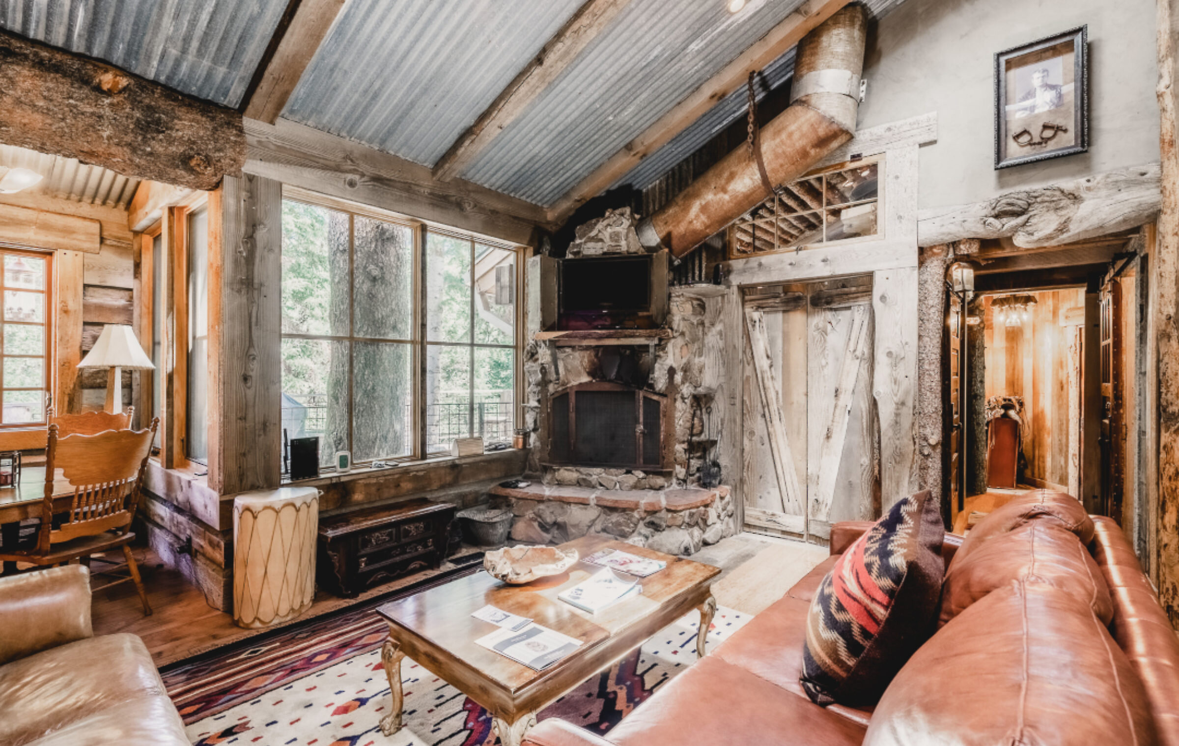 The main floor contains vaulted ceilings, full kitchen, fireplace and bedroom. A loft bedroom is also accessible by ladder, perfect for kids to explore. The master bedroom and bath are located upstairs, with a copper clawfoot tub and steam shower. Enjoy views of the mountain from the spacious deck or hot tub.
